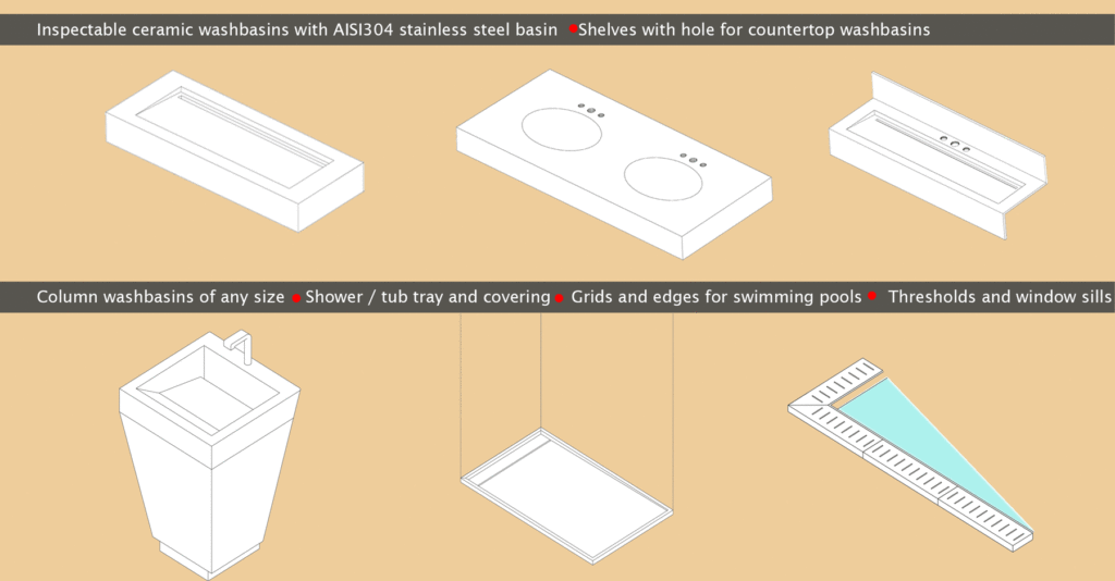 Bespoke design, cut and assembly of any kind of bathroom furnitures: sinks, monolithic sinks, suspended shelves for washbasins, tops for underconter sinks and bathtubs, and shower trays.