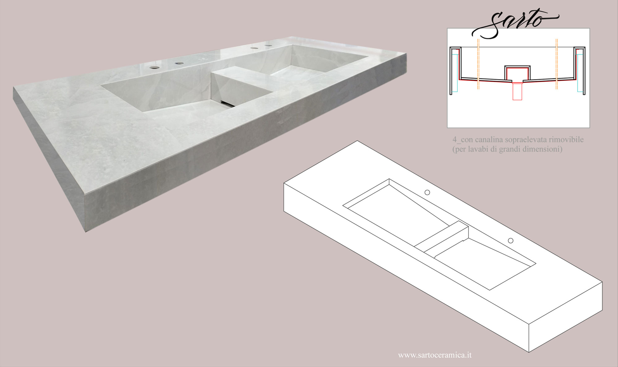 Una soluzione studiata per lavabi di grandi dimensioni, per avere un’unica grande vasca composta da due piani inclinati fissi che defluiscono centralmente in una canalina interamente rivestita e removibile per ispezione della zona scarico.